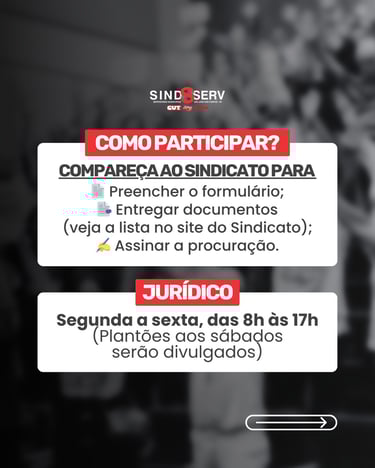 Para participar da ação, é necessário comparecer ao Sindicato para: