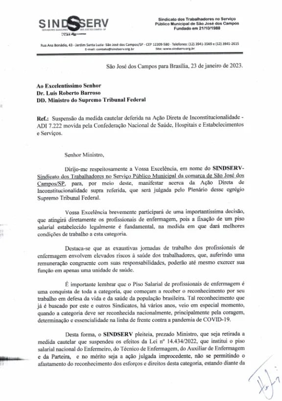 O nosso SindServSJC visando interesse da classe, encaminhou um e-mail ao Ministro Barroso, no qual foi destacada a importância do piso salarial da enfermagem e requerendo a retirada da medida cautelar que suspendeu os efeitos da Lei 14.434/2022.