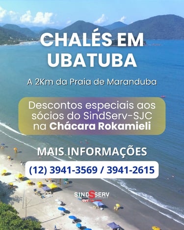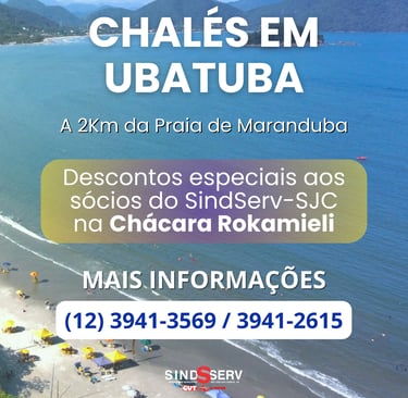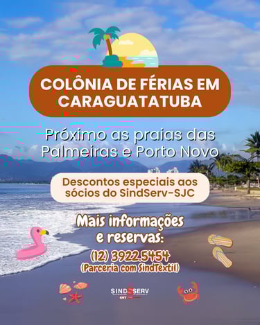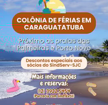 O SindServ-SJC possui uma parceria com o Sindicato dos Têxteis para a Colônia de Férias em Caraguatatuba. Os Servidores sócios podem alugar os apartamentos da colônia com preços e condições especiais. A colônia está localizada na Rua 14, nº 40 - Bairro Porto Novo.